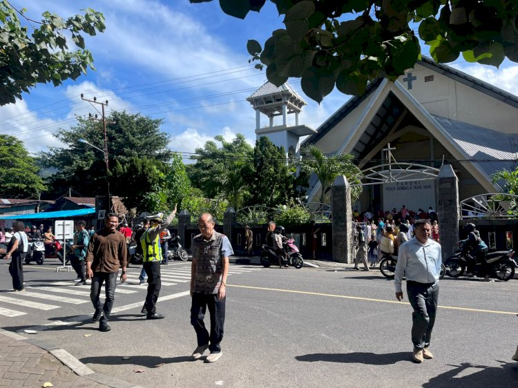 Selanjutnya, Kapolres Alor juga meninjau pengamanan Ibadah Minggu Paskah di Gereja Paroki Yesus Gembala Yang Baik Kalabahi. Ibadah dilaksanakan dalam dua sesi, yakni kebaktian pertama pukul 07.00 hingga 08.40 Wita yang dipimpin oleh Pastor RD. Abrosius Bala Ladjar, Pr., dengan jumlah jemaat sekitar 450 orang, serta kebaktian kedua pukul 09.00 hingga 10.30 Wita yang dipimpin oleh Pastor RD. Maksimus Bulumanu, Pr., dengan jumlah jemaat sekitar 400 orang. Seluruh rangkaian ibadah berjalan lancar, aman, dan kondusif hingga selesai.