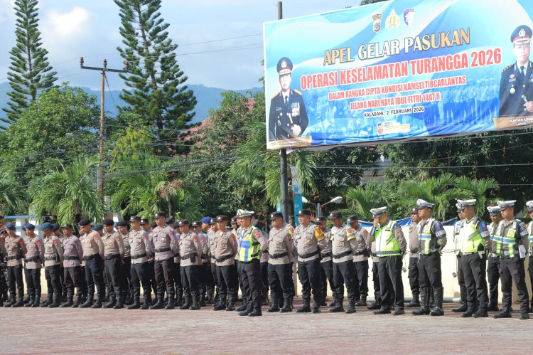 Alor – Wakapolres Alor KOMPOL Jeri Samzon Puling, A.Md., S.H. memimpin Apel Gelar Pasukan Operasi Keselamatan Turangga 2026 yang digelar Senin, 2 Februari 2026 pukul 08.00 WITA di Lapangan Apel Polres Alor. Kegiatan ini dilaksanakan dalam rangka cipta kondisi keamanan, keselamatan, ketertiban, dan kelancaran lalu lintas menjelang Hari Raya Idul Fitri 1447 H. Kasat Lantas Polres Alor IPTU Muhammad Aris S., S.H. bertindak sebagai Komandan Apel.