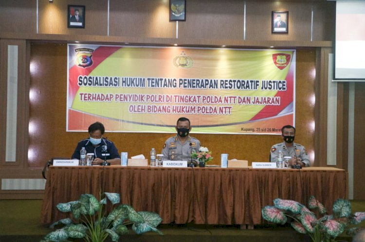 Kepolisian Daerah Nusa Tenggara Timur (Polda NTT) melalui Bidang Hukum (Bidkum) menggelar kegiatan Sosialisasi hukum tentang Penerapan Restoratif Justice terhadap para Penyidik Polri jajaran Polda NTT di Aula Hotel Sylvia Kupang, Kamis (25/3/2021).